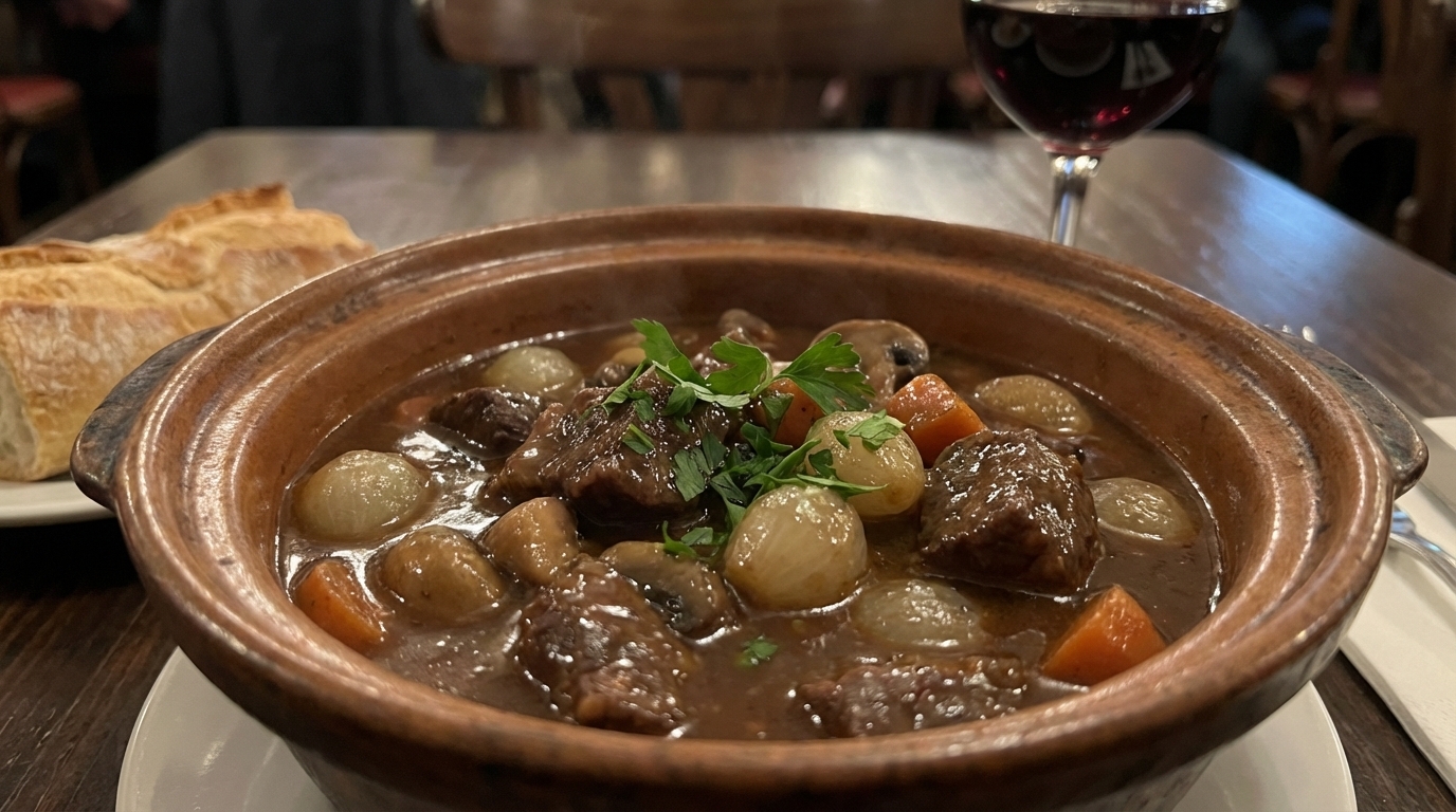 Traditional French soup made from caramelized onions and beef broth. Served with a slice of bread topped with melted, gratinated cheese. Hot and very flavorful.