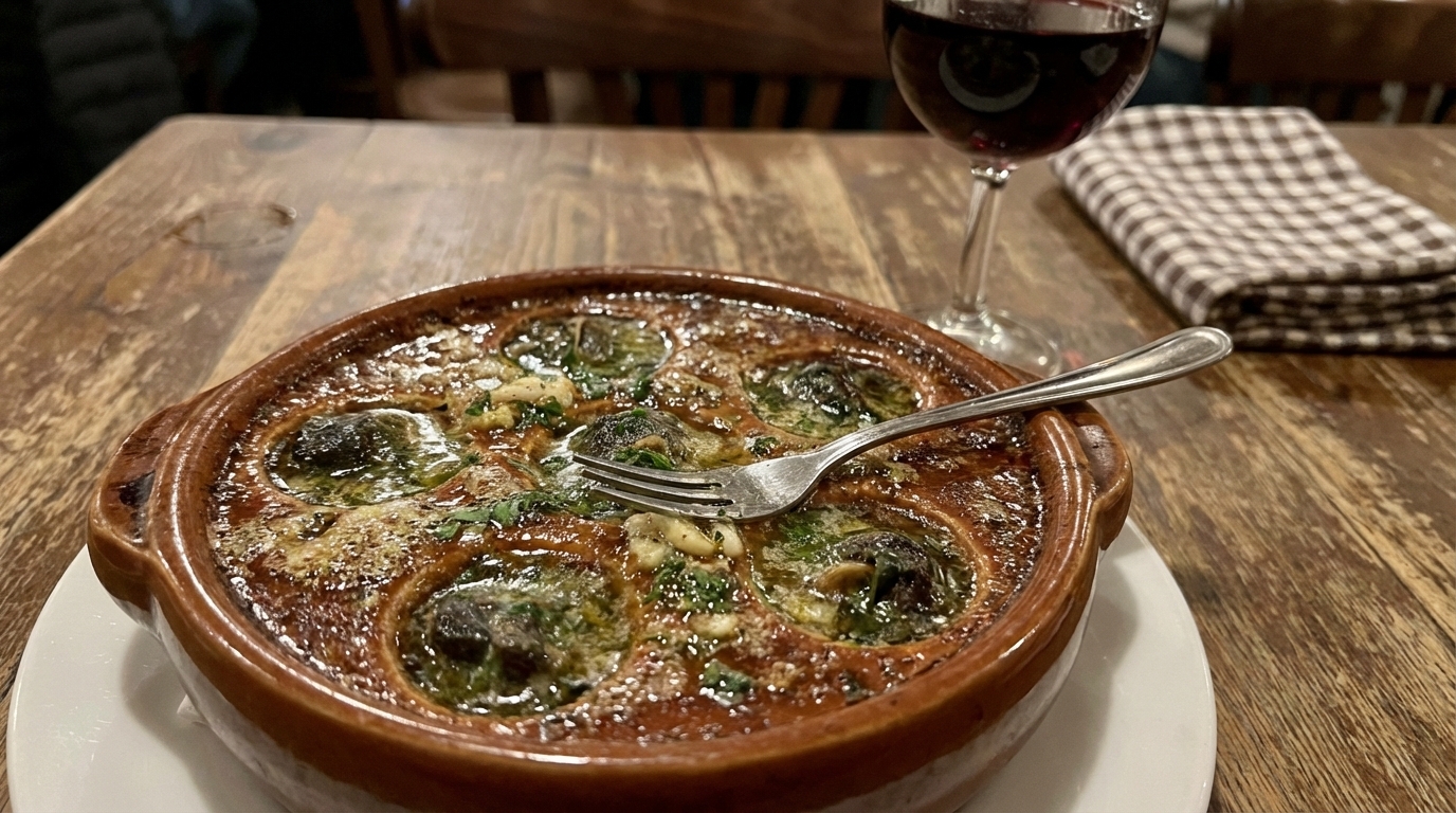 Land snails cooked in their shells with garlic and parsley butter. Tender texture and rich herbal taste. Use the provided picks to extract the snail.