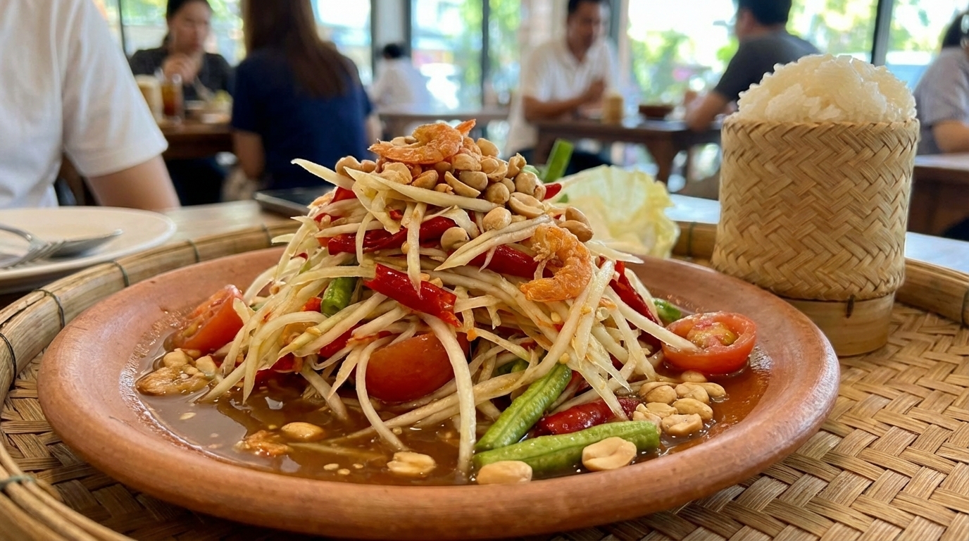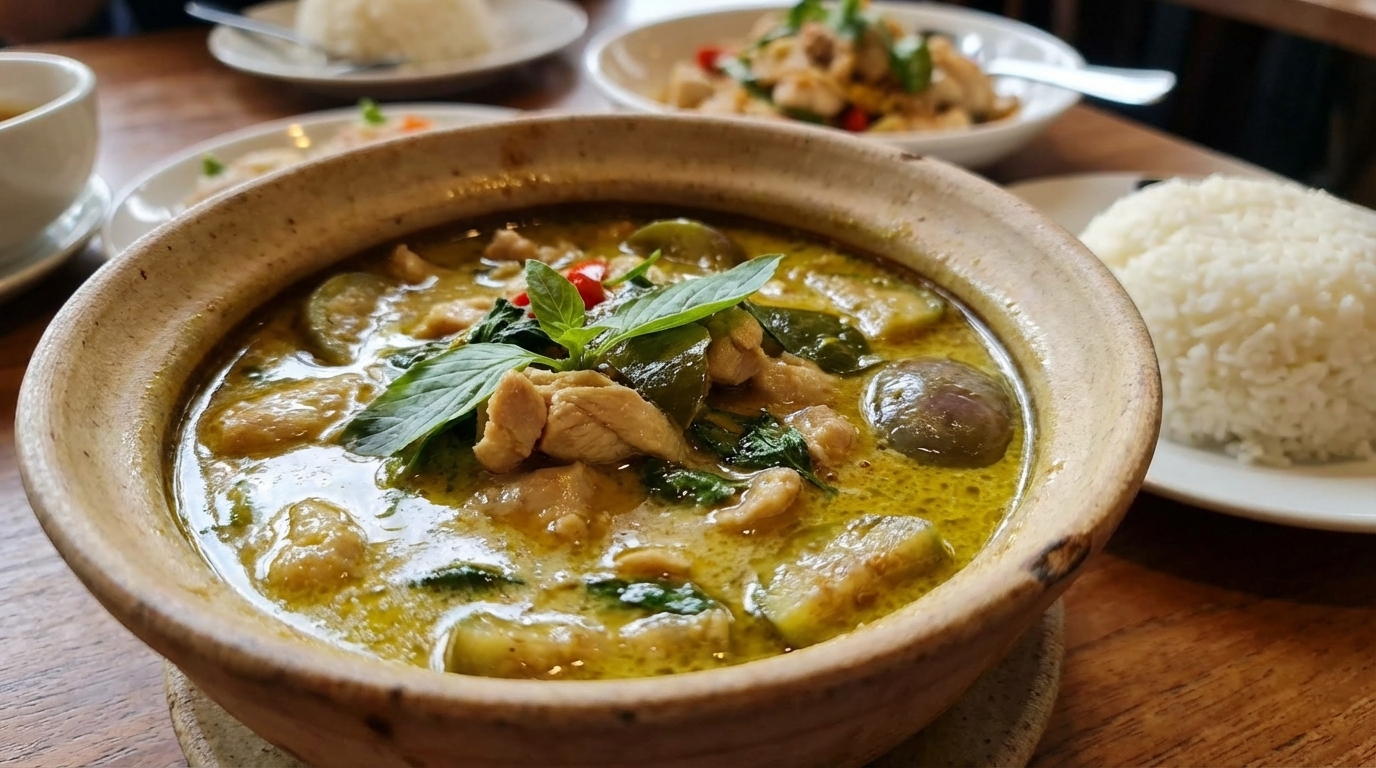 A fusion pasta dish combining Italian spaghetti with Thai-style spicy basil pork meatballs. It features the aromatic heat of holy basil ('krapow') with a savory sauce. A unique and flavorful East-meets-West option.